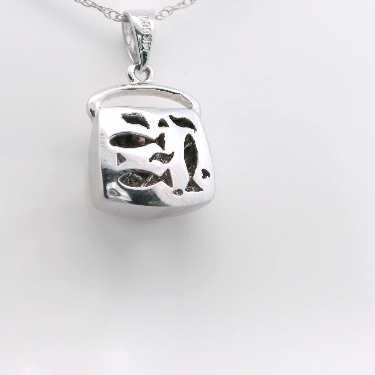 This sweet white gold, ruby & diamond purse pendant on the front and features a unique design of fish swimming gracefully, symbolizing freedom and tranquility on the back of the pendant. On a delicate white gold 16” chain.